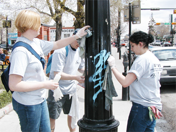 Volunteers tackle graffiti on 17 Avenue during a graffiti clean-up in 2002.
