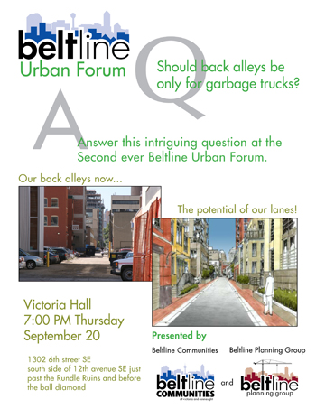 The second Beltline Urban Forum took place on September 20th, 2007. The topic was how to better use Beltline’s Laneways. Bureaucratic impediments and inexperience have lead Calgary to overlook the potential of our downtown back alleys. Other cities throughout the world use their laneways as secondary streets. They include residences and small businesses that open onto the lane. Lanes also create opportunities to add landscaping to improve the view from neighbouring buildings. The second Beltline Urban Forum will ask experts and the community "Are back lanes only for garbage trucks?"