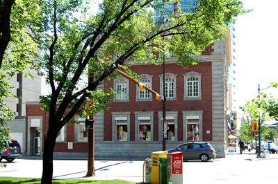 The Canadian Bank of Commerce expanded rapidly into the Prairies in the decade before the First World War. It provided prefabricated wood buildings for smaller Prairie towns, and built substantial masonry buildings in the cities. This south Calgary branch of the bank was erected in 1912. The architect is not identified, although it should be pointed out that most of the bank's branches at this time were designed by the prestigious Toronto firm of Darling and Pearson. The three-storey brick building is faced in red brick, with substantial stone trim being used for quoins, base, architrave, and elaborate window surrounds. The classicizing design can best be described as an essay in the Georgian Revival style (pundits of the day might have called it French Renaissance), and it is an excellent example in Calgary of this manner and of architectural design. The building sits on a corner site and presents a front to both streets, and is a very visible element in a good streetscape. (Calgary Heritage Authority, Building Summary 11-109) In 1909, the Canadian Bank of Commerce opened its south Calgary branch in the small building that still stands across the street at 1205-1st Street S.W. In 1912 the bank constructed this three-story brick building, complete with apartments for the manager and other staff members, and similar to other branches elsewhere in the country. A 1961 merger with the Imperial Bank of Canada yielded the bank’s unwieldy new name Canadian Imperial Bank of Commerce (eventually simplified to CIBC). The branch closed by the early 1980s, and after intermittent uses it became Formans Men’s and Women’s Fashions in 2004. (Historic Walks of Calgary, Harry Sanders, 2005, Red Deer: Red Deer Press, pp .232-233)