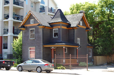 1912 1313 Centre Street S This residential turned commercial building is one of the two remaining structures that have a direct relationship with the first and second generations of the Cushing family in Calgary. As well, it is the only remaining original Cushing residence. Ellen Cushing, wife of John Cushing (brother of W.H. Cushing and A.B. Cushing), originally purchased purched the lot between 1900 and 1904 after the death of her husband in 1899. George, their eldest son, lived for a time in his mother's home at 101 13 ave SW. George moved one lot over into the then new house at 1313 Centre Street SW. In October of 2005 his mother's home was demolished. Beginnings in 1908, George worked for his uncle W.H. Cushing's company, Cushing Bros. Ltd. In 1909, George was employed was a cheif salesman with his uncle's firm. By 1911, he held the position of assistant manager, and local manager. In 1912, he was appointed treasurer of Cushing Bros. Ltd. George C. Cushing transferred to Regina, Sask. in 1916, where he acted as local manager of Cushing Bros. Ltd. until 1930. George was killed in an automibile accident on Oct 26, 1930. George married Sarah Minetta (Nettie) McKerman in 1906, and they had their first son, Regianl Clarence in 1910. In 1920, they had their second son Clifford John. Lance Corporal Clifford John Cushing was killed at the Battle of Normandy, France, in 1944. This building is a two-storey wood frame structure complete with gabled roof. The unique design is asymmetrical and incorporates a covered porch and main entrance between the two perpendicular wings. Above the porch, is a tower that is accented by a finial. The exterior walls retain their original wood siding and architectural shingle details. The soffits exhibit detailed woodwork, as do the gables. The house also retains original window details such as latticed and leaded windows. The Cushing Bros Ltd catalogue features many of the decorative elements found on the house such as columns etc. It is likely that lumber was provided by A.B. Cushing Mills.