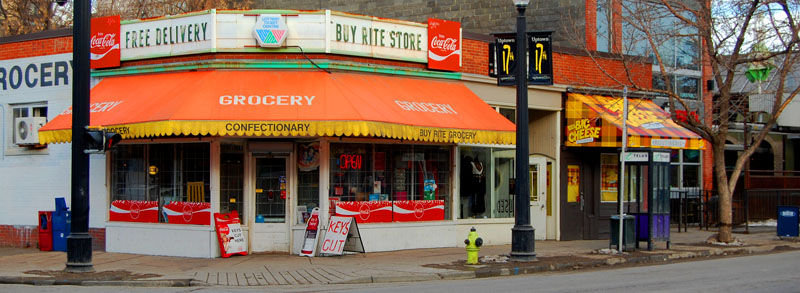 Since around 1954, the corner storefront has housed the Buy-Rite grocery store. Longtime owner J.Leslie Hill bought the store in 1936, when it was located in the nearby Mount Royal Block, and moved it to the present site around 1954. Hill was an alderman from 1949-1952, and also served as vice-president of the Alberta Social Credit League, president of the Southwest Calgary Business Association, and chairman of the Calgary Retail Merchants Association. He still owned the Buy-Rite when he died in 2959. Subsequently owners have maintained the business under the same name. This building has two other storefronts facing 17 Avenue, and for many years one or both of them housed Bon Marche Millinery. A rear brick addition built around 1941 has functioned as a seperate address (1606 7 Street SW) since about 1960. The first occupant listed at that address was the Mona Lisa Art Salon, now housed next door. The building is a load bearing, one storey brick structure. Although constructed in the 1920s, the design is typical of the earlier Edwardian Commercial style. It featured three contiguous recessed storefronts facing 17 Avenue, each with large display windows, clerestory windows, bulkhead, and a pressed metal signband cornice. It also featured a prominent corner entrance doorway at the intersection. Located on a prominent street, opposite Tomkins Gardens, it was a highly visible business with frontage on both 17 Avenue and 7 Street SW, Although the building now houses seperate businesses within each of the three store-fronts, it retains its early commercial charm.
