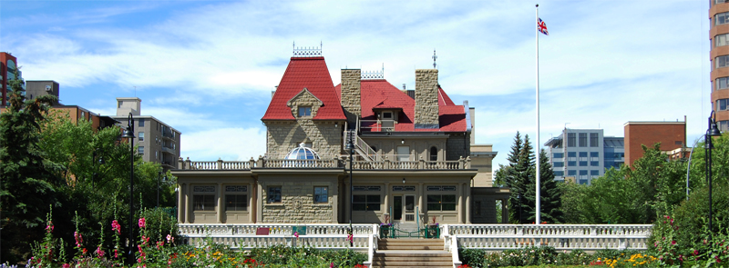 An impressive mansion by todays standards (surely the grandest in town when it was built) was the home of Sir James Alexander Lougheed, one of the most distinguished of Calgary's early business, social, and political leaders. Lougheed was born in Brampton, Ontario in 1854. He arrived in Calgary in 1883, and became the young town's first lawyer. In that same year, he married Belle Christine Hardisty, daughter of the Cheif Factor of the Hudson's Bay Co. Three years later, Lougheed needed help with expanding his law practice, and so he brougt in a junior partner named R.B. Bennett - the future Prime Minister of Canada. Lougheed was appointed to the Senate in 1889. He was active in real estate and development, and was a founding partner of Calgary Petroleum Products, principals in Dingman strike of 1914. Lougheed built his mansion on 13 Avenue in 1891. When Beulieu (as the Lougheeds named the house) was constructed, it sat alone on the windswept prairie beyond the growing town of Calgary. Beaulieu is picturesquely massed and composed, with an octagonal tower and a gable facing the street and a steep pavilion roof on the garden facade. The walls are rusticated sandstone from the Oliver quarry. Beulieu is a very good example of Victorian eclectic design. The interior details include wall panelling of Spanish mahogany and numerous stained glass windows. Having surveyed the 6 Street SW right through the gully, The City pased a bylaw in 1901 exchanging land with the Senator and allowing construction of the roadway around the marsh. Beaulieu's terraced gardens were then created in the hollow. A sculptural fountain in the form sunken garden. In the SE corner of the property, a patch of unploughed prairie served as pasture. Beaulieu was used for entertainment on a grand scale, and guests included Their Royal Highnesses, the Prince of Whales and Prince George, as well as the Govenor General, H.R.H. the Duke of Connaught. The house was a center of Calgary social life for several decades. Sir James died in 1925, and Lady Lougheed in 1936. Two years later, the house reverted to the City for unpaid taxes. The Canadian Red Cross Society rented the house in 1947 and purchased it a year later. In 1978, the organization moved into a new building just to the west. The house was designated as a Provincial Historic Resource in 1977, and in 1979, the Alberta gevernment purchased the mansion. The Lougheed House was designed by architect James R. Bowes of Ottawa. Beaulieu has been recognized by the federal government as a National Historic Site. In 1993, the City of Calgary purchased Beaulieu's former garden and pasture property (the Eastern portion of the block). Alberta Community Development replaced the roof in 1994. On January 20, 1995 the Lougheed House Conservation Society was incorporated. Representing the public, this Society entered into a three-way partnership with the City of Calgary and the Province of Alberta to develop the Beaulieu gardens. The Lougheed House has since been reopened as a key heritage attraction in the city of Calgary.
