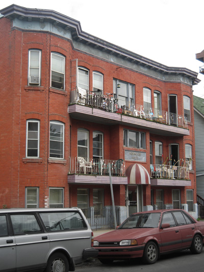1912 1208 15 Avenue SW This three-storey brick apartment building is one of four contiguous historic structures built for businessman Walter James Brigden (circa 1873-1961) between 1909 and 1912. It was built at the peak of Calgary’s pre-First World War population and real estate boom. The City’s population had increased more than tenfold in a decade, rising from 4,398 in 1901 to 43,704 in 1911. Before the peak of the boom, apartment buildings in Calgary provided high-class accommodation. Working-class families preferred detached homes, which contrasted the high-density housing they had known before moving here, and appealed to their dreams of upward mobility. At the height of the boom, housing demand outstripped supply, and rising prices placed home ownership beyond the means of many workers and their families. New apartment buildings like the Norwood provided affordable working-class housing. Brigden was a London-born grocer who settled in Calgary in 1906. He bought Lots 21-24 in Block 99, Plan A1, in 1909. Brigden built three structures on Lots 21-22: a corner grocery at 1421 - 11 Street S.W., which he initially operated himself (1909); the two-storey frame Brigden Shops at 1415-19 - 11 Street S.W. (1910); and the two-storey brick Bridgen Block (1912). Brigden owned these three buildings until 1959, when they became property of Republic Investments Ltd. In 1912, he built the Norwood Apartments, which he quickly sold, on the adjacent Lots 23-24. A building permit was recorded on September 23, 1912, for "Br[ick] Stores + Rooms" to be built at an estimated cost of $7,500. The builder was S. G. Tetley. Tax records indicate that Brigden sold the building around 1913, and that the next owner, from around 1913-1927, was Maria Soulier van Stoutenberg (alternatively expressed in the tax records as Madame Houtenberg), who owned it until around 1927. She was evidently an absentee owner, and nothing is known about her. Lou Michael of Gleichen evidently owned and lived in the building from about 1927-1929. The next longtime owner, from about 1928-1964, was Wallace Chapman Auld. Little is known of Auld, except that he had been a hardware merchant in Castor, Alberta, and had worked in (and probably managed or operated) the power plant there in the late 1920's before moving to Calgary. Listing in Henderson’s Directory indicate that the tenants have been largely working-class, although there is one notable example: M. C. Brownlee, the manager of the Great West Saddlery Company, who briefly lived in the Norwood around 1913 and evidently occupied at least two suites. Fire damaged a second floor suite on August 25, 1976. The apartment building is executed in Edwardian Classicism, but in a very simplified form. It is a wood frame structure clad in red brick. The facade is symmetrically organized, and features a central arched entrance flanked by full height bay windows. There are open balconies on the upper two floors. The building is finished with a pressed metal cornice/entablature. At the side, the building has a narrow window well providing internal lighting. The rear has full width wood balconies.