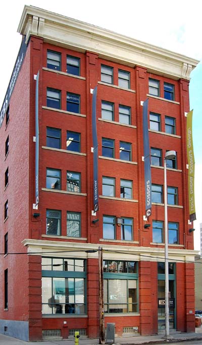 1913 809 10 Avenue SW This six-storey warehouse has served a number of Calgary businesses over the years. It is typical of the buildings which sprang up in this warehouse district in the early years of the present century. It was built circa 1911, for the Calgary Paint & Glass Co. Ltd., and other early occupants included the Ontario Wind Engine & Pump Co. Ltd. (manufacturers and gasoline engineers), Riley & McCormick Ltd. (manufacturers of saddles and harnesses), and Canadian Westinghouse Co. In 1918 the building was aquired by the Ordnance Store Corps. of the Canadian Army, and remained in this use for fifty years. In recent years, the best known occupant was The Albertan, who used it for storage, and the Canadian Art Galleries. The buildings was contstructed by Fyshe, McNeil, Martin, Trainer, engineers and general contractors, who built a number of other structures in Calgary, Edmonton, and Medicine Hat during this period, including the Hollinsworth Building. The Calgary Paint & Glass Co. warehouse represents a very good example ofwarehouse design of the period, with its regular facade accented by horizontal string courses between the floors and vertical pilaster strips reaching the height of the building. An entabulature divides the tall ground floor from the other stories, and a large cornice with end brackets crowns the building.