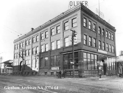 Calgary’s oldest remaining warehouse was also among the first to undergo “adaptive reuse” when it was converted into modern offices and a restaurant in the early 1980s. The Tudhope, Anderson Co., an agency that represented eight different agricultural implement manufacturers, occupied the building from 1906-21. Later occupants included the Hedley Shaw Milling Co., Oliver Agricultural Implements, James Storage & Cartage, and, finally, Bekins Moving & Storage, before the building’s restoration in 1980. A 1993 pink and turquoise colour scheme was sandblasted off a decade later. The two round-headed rear loading bays have been closed in with concrete block and glass, forming Palladian-style windows that match the arched front entrance and east-facing rounded window. The front façade has been severely modified.