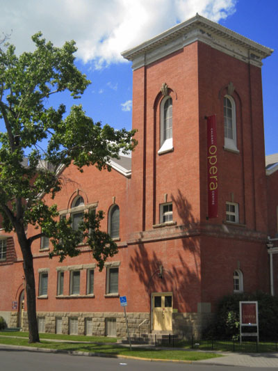 The Second Methodist Church was first organized in Calgary in 1906. A leader in its founding was the Reverend G.W. Kerby, Pastor of Central Methodist Church. Nellie McClung lived just down the street and was a church member. Wesley Methodist was initially built in 1906 and expanded two years later. Even enlarged, the building proved to be too small. So inn 1911 a fund was started for a lager building. Senator James A. Lougheed, Public Works Minister William H. Cushing, and future Prime Minister R.B. Bennett were early contibutors. On December 17, 1911 the existing Tuscan styled building was dedicated. As early as 1909, the congregation had contemplated amalgamating with nearby Grace Presbyterian Church. The two congregations sometimes held joint services when the minister of one went on vacation. In 1925, Wesley Methodist and some Calary Presbyterian churches merged with other Protestant denominations into the new United Church of Canada. Grace Presbyterian declined to join, remaining as "Continuing Presbyterians". The building is a good example of plain Methodist design, its details being somewhat classicised with round arched and simplified Palladian windows. A decorated cornice tops the square corner tower. An addition was added to the auditorium in 1903, a gallery was added to the sanctuary volume in 1930, and the building was expanded to the rear in 1956. The inner-city church declined in membership as post war families moved to the suburbs. It was finally desanctified and closed in 2003. The building then housed the Jubilee Christian Fellowship. Calgary Opera acquired and renovated the building to accommodate a 3,200 square-foot rehearsalo hall and performance space along with studios, wardrobe space and headquarters offices. On the second floor, the group also operates community education and outreach programs. On the lower level, the company maintains a warm-up area, dressing rooms, the wardrobe shop, and prop strorage. The centre is also used to support Calgary's Emerging Artist Development Program. The former Wesley Methodist Church has now been repurposed, renovated and renamed the Arrata Opera Centre. It is a vital and vibrant part of Beltline's participation in arts and culture in Calgary.