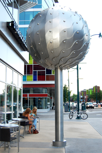 Light, the Universe and Everything by artist Jeff de Boer This sculpture, commissioned for Hotel Arts Complex, is a part of the now-defunct developer TORODE’s commitment to becoming a leader in promoting art and culture in Calgary. Celebrated local artist Jeff de Boer, with his team, created this steel and multi-coloured light sculpture sitting 18 feet (6 metres) high from 144 overlapping plates that connect to each other. Between each plate is a space that is filled with Plexiglas and LED lights. About the ArtistJeff de Boer is a Calgary-based multi-media artist with an international reputation for producing some of the world's most original and well-crafted works of art. With an emphasis on metal, he is best known for such bodies of work as suits of armour for cats and mice, armour ties and sword-handled briefcases, rocket lamps and pop culture ray guns, and exquisite high art, abstract works called exoforms